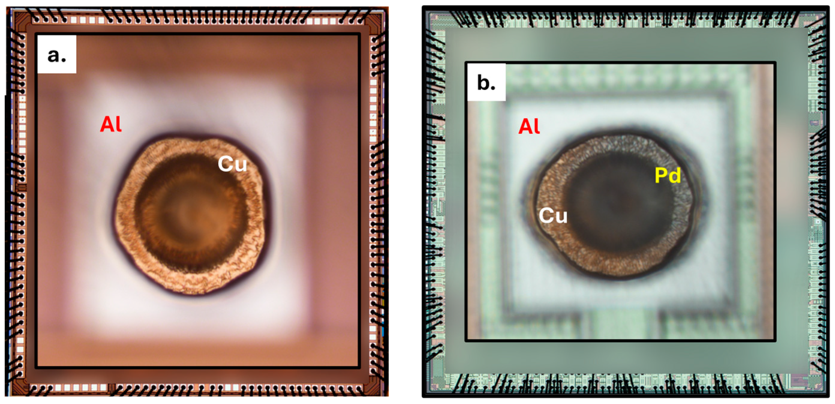 - Qin, W.; Anderson, T.; Chang, G. Mechanism to Improve the Reliability of Copper Wire Bonding with Palladium-Coating of the Wire. Microelectron. Reliab. 2019, 99, 239–244. [Google Scholar] [CrossRef]