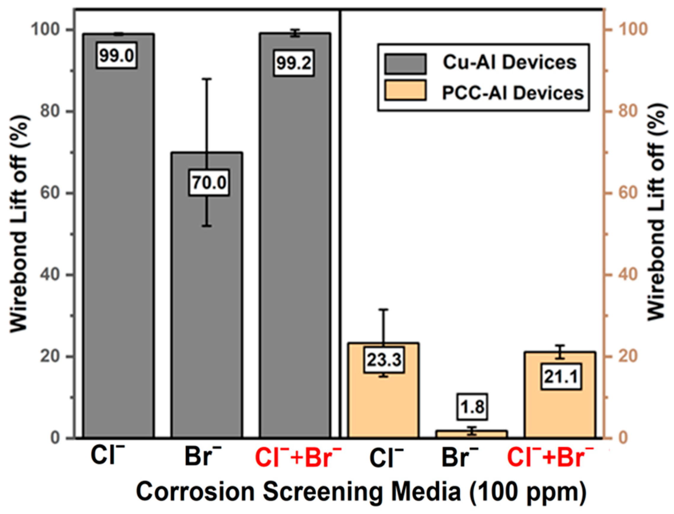- Ross, N.; Asokan, M.; Ashok Kumar, G.I.; Caperton, J.; Alptekin, J.; Salunke, A.S.; Chyan, O.M. Mechanistic Study of Copper Wire-Bonding Failures on Packaging Devices in Acidic Chloride Environments. Microelectron. Reliab. 2020, 113, 113917. [Google Scholar] [CrossRef]