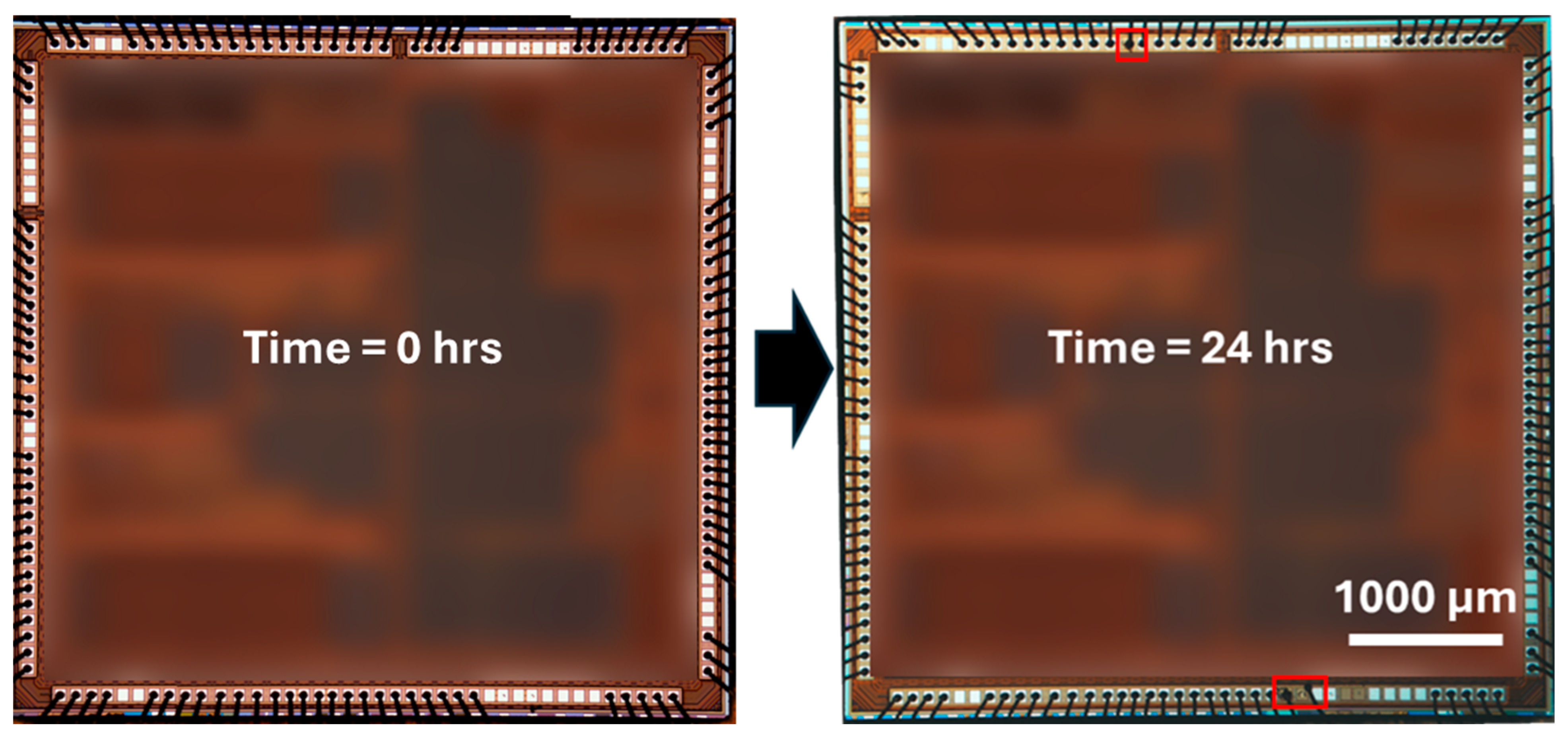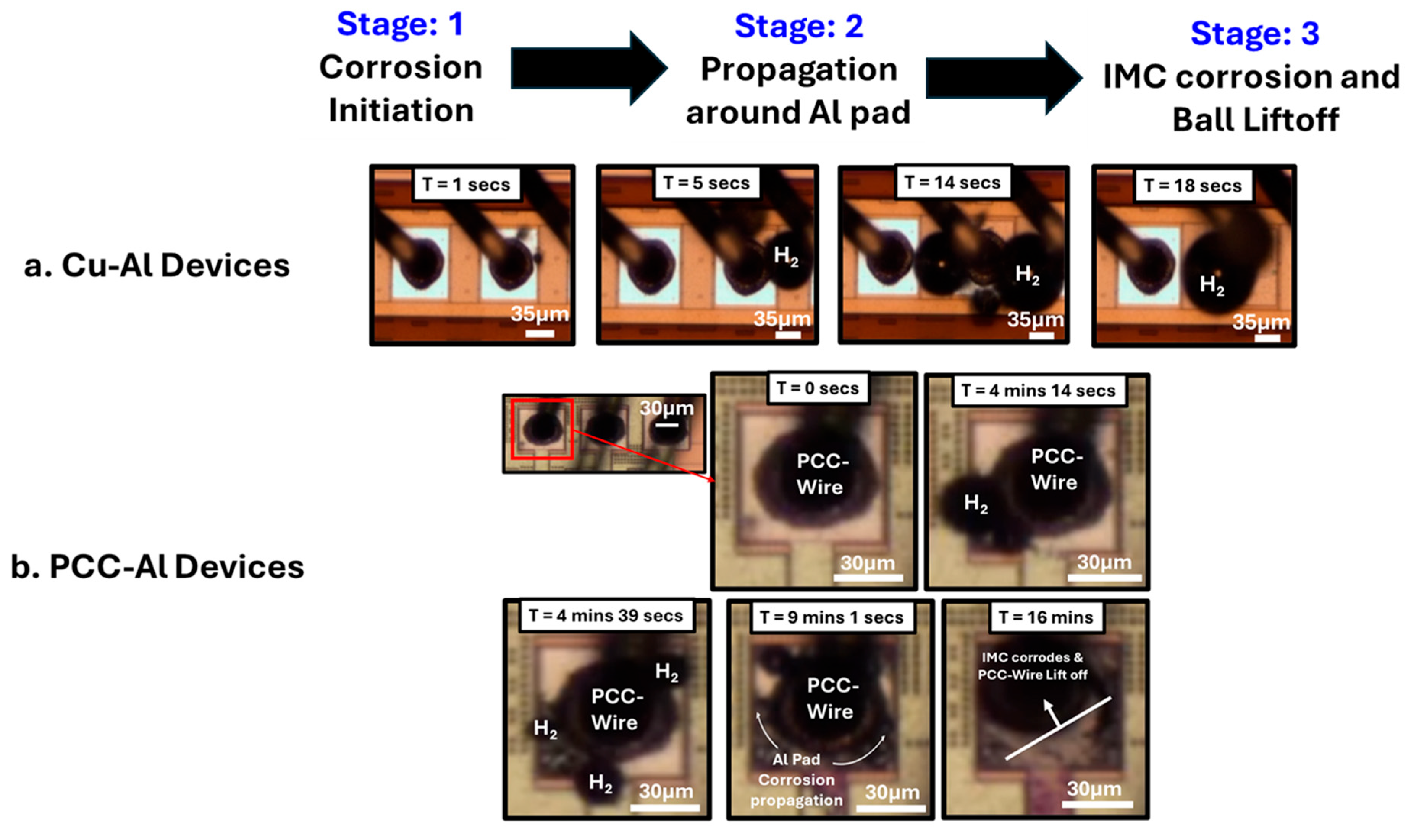 - Propagation of Al pad corrosion, leading to dendrite and mud crack formation in the aluminum pads.