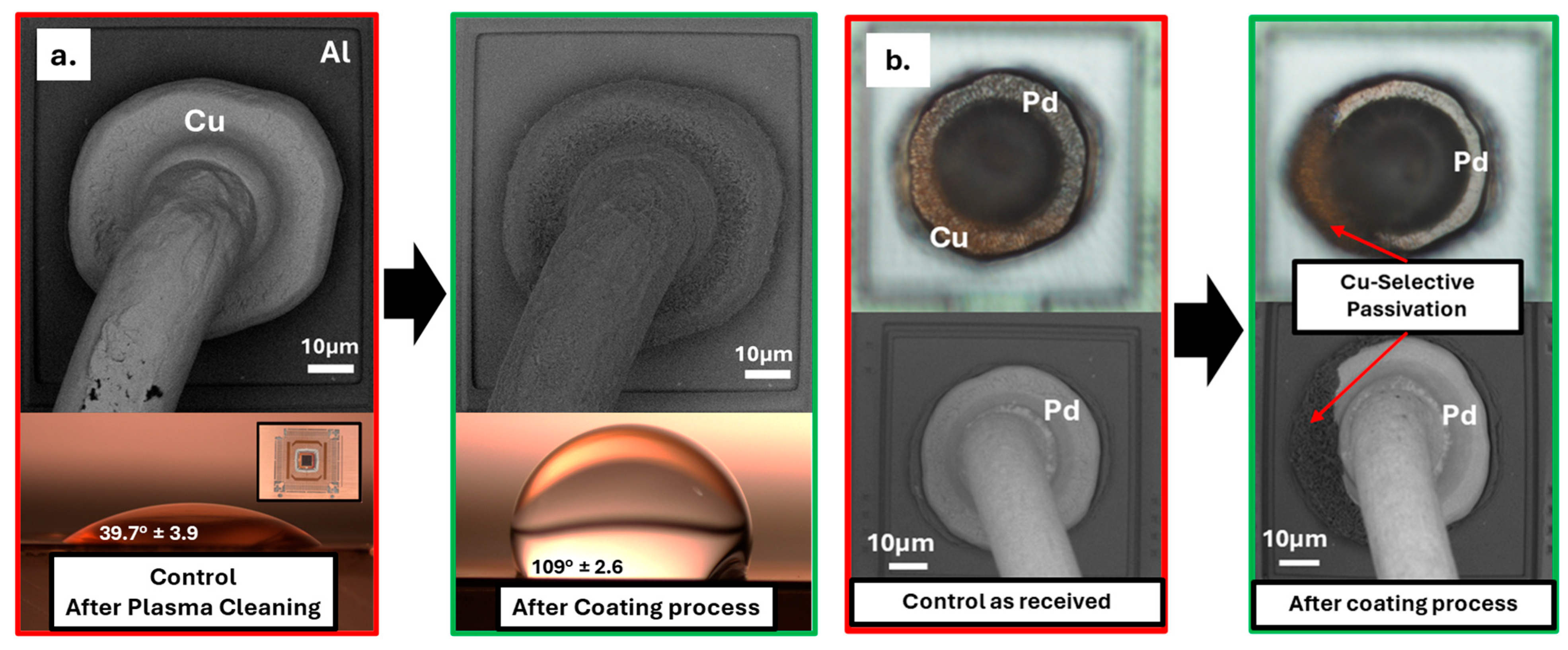 - Alptekin, J.; Antony Jesu Durai, K.; Kumaravel, D.K.; Estridge, L.; Chyan, O.; Ibrahim, R.; Li, G.; Mathew, V. A Cu–Cu Wire-Bonding Enabled by a Cu-Selective Passivation Coating to Enhance Packaging Reliability. IEEE Trans. Compon. Packag. Manufact. Technol. 2023, 13, 1923. [Google Scholar] [CrossRef]