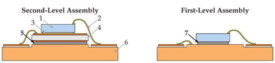 Second- and first-level packaging concepts: (1) optoelectronic bare die, (2) top contact wirebond (3) and (7) die-attach sinter interface (4) submount, e.g., ceramic carrier or copper–tungsten submount, (5) submount sinter interface (6) package platform, e.g., copper board, TO-can, copper micro channel cooler. In the case of Cu sintering, all metalization could be Cu.