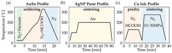 (a) Soldering profile of AuSn, (b) pressureless sintering profile of Dowa Ag nanoparticle paste, (c) pressure sintering profile of Cu particle free ink.