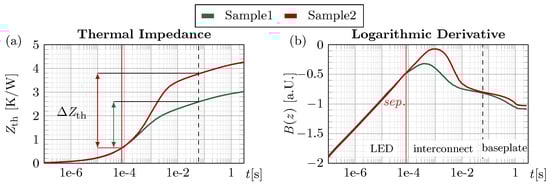 Since  and  act only as scaling factors, they appear as an offset in the logarithmic representation; thus, shifting different -curves onto each other in intervals of equal heat paths eliminates these dependencies. This is illustrated in Figure 5 for two first-level samples with different interconnects. The  curves (Figure 5a) separate around 80 µs due to an obstructed heat flow in the die attach of Sample 2, before following the same thermal path again from approximately 0.6 ms onward, corresponding to the baseplate time domain. Both points in time, indicated by vertical lines, are difficult to identify in the -representation but become evident in the -curves. The change in thermal impedance within this interval, , reflects a comparable increase mainly attributed to the die interconnect. However, since  represents the superposition of all thermal responses [,] in the thermal path,  also includes contributions from other layers. Defining the end of influence of a specific layer in the time domain is challenging in both representations, which is why a shared reference point of equal heat flow, i.e. converging  curves, in the late domain is used. Methods such as the structure function overcome this by separating layer contributions via deconvolution, though resolution and arithmetical precision are critical for resolving thin interconnects, increasing the computational effort. Overall, the  method provides an effective way to compare the module thermal performance, but does not yield the exact  of an individual layer.