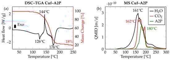 (a) DSC–TGA curve indicating change in heat flow (W/g) and mass change (%) during the thermal decomposition of Cuf–A2P complex []. (b) MS curve indicating the release of gaseous byproducts during the thermal decomposition of Cuf–A2P complex [].