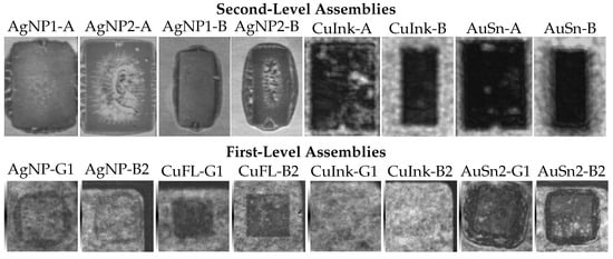 First- and second-level interconnects are investigated with samples as illustrated in Section 2, Figure 2. The first-level assemblies comprised LEDs with die sizes of 1 mm2 and 2 mm2, designated as G1 and B2, respectively. These interconnects are prepared with AuSn preforms (thin: AuSn1, thick: AuSn2), Ag nanoparticle paste (thin: AgNP1, thick: AgNP2), Cu particle-free ink (CuInk), and a Cu flake-based paste (CuFL). The second-level assemblies with a 1 mm2 LED B1 on a larger submount A (4.5 × 3.3 mm2) and smaller submount B (3.3 × 1.5 mm2) were prepared and evaluated in a similar manner. All samples are based on a 15.5 × 27.0 mm2 Cu baseplate of 1.5 mm height and NiPdAu metalization.
