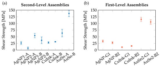 The shear test results are summarized in Figure 9, with corresponding shear modes shown in Figure 10. At the second-level, AuSn interfaces exhibited shear strengths of 138 ± 12 MPa (submount B, small) and 64 ± 14 MPa (submount A, large), representing a 58–60 % increase over thin AgNP1 (B: 55 ± 8 MPa, A: 27 ± 6 MPa). Cu ink samples (B: 31 ± 1 MPa, A: 28 ± 3 MPa) performed comparably to AgNP, with AuSn yielding a 56–78 % higher strength. Notably, the larger AuSn submounts A showed a ~46 % drop in shear strength compared to samples of submount B, attributed to impaired degassing and, hence, void formation, visible in the SAM images (Figure 8). For the die attach (Figure 9b), AuSn soldering again achieved the highest shear strengths (116 ± 7 MPa and 105 ± 8 MPa depending on die size), about 72–76 % higher than AgNP (G1: 33 ± 4 MPa, B2: 28 ± 4 MPa), consistent with the irregular interfaces of the SAM images (Figure 8). Compared with Cu ink (G1: 11 ± 1 MPa, B2: 15 ± 2 MPa), AuSn showed an improvement of 87–91 %, in agreement with the unresolved SAM images, indicating that the applied sinter pressure of 10 MPa was insufficient to compensate for surface roughness after predrying (Figure 7b).