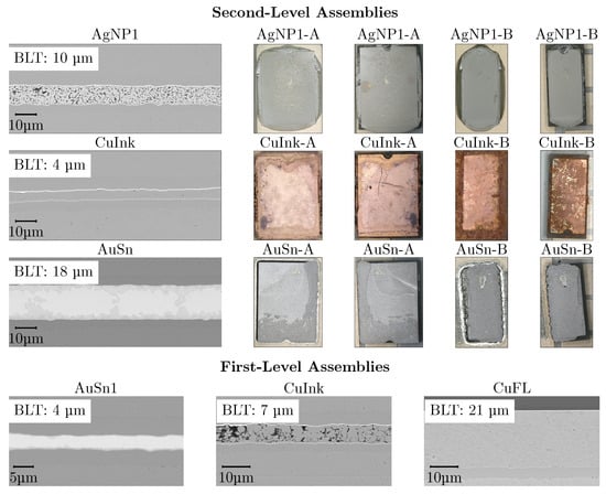 Figure 10 also compares the bondline thicknesses (BLT) of the first- and second-level assemblies. For the second-level AgNP1 assemblies, the BLT was about 10 µm with a porous structure caused by voids from organic degassing during pressureless sintering. The CuInk assemblies showed a very thin BLT of 4 µm; this dense homogeneous layer results from applying 30 MPa, preventing pores and inclusions. AuSn assemblies exhibit a thicker BLT of 18 µm, yet remain uniform due to the pressureless soldering of preforms. To benchmark against typical AuSn die attaches (2–4 µm), first-level AuSn1 assemblies were prepared with a BLT of 4 µm using pressure. Since the LEDs could only withstand 10 MPa, CuInk assemblies were processed under the same conditions, yielding a 7 µm layer height. Cross sections reveal a porous non-uniform structure with poor shear strength (as seen in Figure 9). In order to benchmark Cu interconnects, Cu flake paste samples were stencil-printed, producing a 21 µm BLT with a thick, yet homogeneous, bondline.
