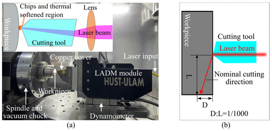 Experimental validation of LADM cutting. (a) Photograph of the experimental setup; (b) schematic illustration of the groove cutting experiment.