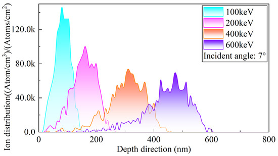 Figure 4 shows the depth profiles of P ions implanted at different incident energies under a fixed incidence angle of 7°. It can be observed that, as the incident energy increases, the peak positions of the P ion distributions gradually shift deeper into the target, indicating that the average penetration depth of the ions increases with energy. At the same time, the shape of the ion distribution curves changes. The peak concentration decreases, while the distribution broadens. This indicates that high-energy ions undergo a longer energy dissipation process within the target, resulting in a more dispersed spatial distribution of implanted ions. This behavior reflects a fundamental phenomenon in ion implantation: under the same material and incidence angle conditions, the projected range of ions increases nonlinearly with incident energy, while the local peak concentration is diluted due to the extended penetration depth. It is noteworthy that the unit of ion concentration is expressed as (Atoms/cm3)/(Atoms/cm2), representing the probability density of ion distribution per unit implantation dose. Although this unit does not directly correspond to the absolute concentration, multiplying it by the actual implantation dose (in ions/cm2) yields the true dopant concentration (in Atoms/cm3). Therefore, these results provide a theoretical basis for selecting appropriate implantation energy and dose combinations to achieve a desired dopant depth and concentration.
