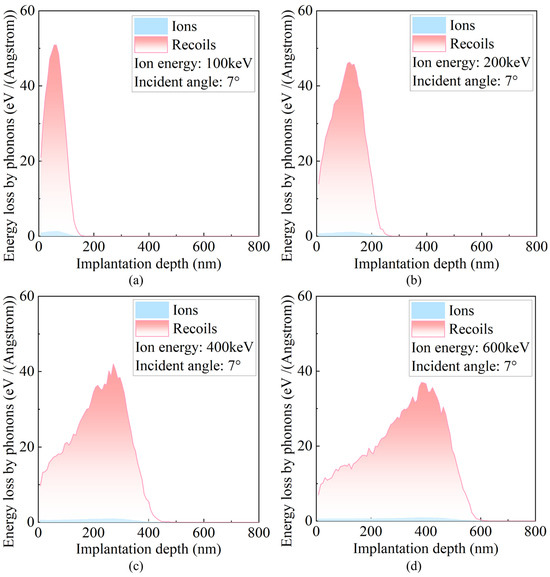 When ions or recoiled atoms with different kinetic energies collide within a crystal, their effects on target atoms depend on whether the transferred energy exceeds the displacement energy . If the energy transferred during a collision is below this threshold, the target atom may undergo slight displacement or vibration, but not enough to leave its original lattice site. Such collisions do not create permanent defects; instead, they induce local lattice perturbations, manifesting as short-lived oscillations of atoms around their equilibrium positions. In this process, the kinetic energy is no longer propagated as momentum but is converted into phonons via lattice vibrations. Due to strong coupling between atoms in the crystal, the vibration of one atom induces synchronous vibrations in neighboring atoms, generating phonons that propagate as waves. When an atom is displaced from its original lattice site, its binding energy is transferred to phonons generated by the recoiled atom. The remaining phonons are produced by ions or recoiled atoms that transfer energies below to lattice atoms. As shown in Figure 7, at low ion energies, recoiled atoms are mainly concentrated near the surface, and the corresponding phonon energy deposition is similarly localized. With increasing ion energy, recoiled atoms can penetrate deeper into the lattice, triggering collisions and causing the spatial distribution of phonons to extend further into the material. The peak depth of phonon energy deposition shifts deeper with increasing ion energy, indicating that the region of active atomic vibrations within the material also moves inward. This is because high-energy ions are more likely to induce oscillations of deeper atoms. Simultaneously, the peak intensity of phonon energy deposition slightly decreases, suggesting that the number of locally excited phonons per unit volume is reduced. In other words, energy is distributed more uniformly, and local accumulation effects are diminished. Further analysis reveals that incident ions themselves contribute negligibly to phonon generation, which is almost entirely produced by recoiled target atoms.