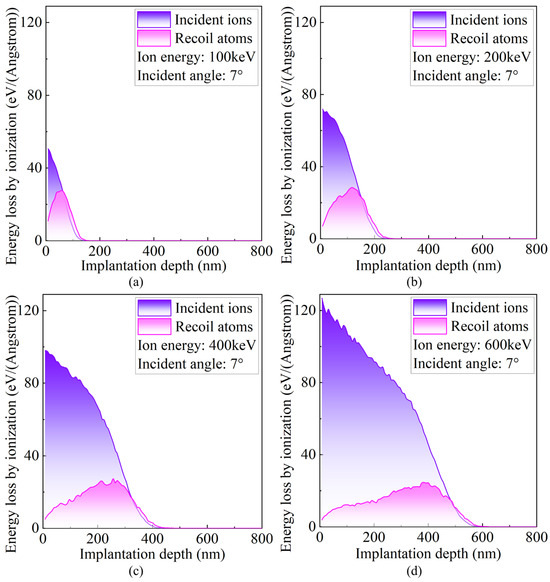 Figure 8 presents the energy distribution transferred via ionization from incident ions and recoiled target atoms at different incident energies. Ionization energy loss refers to the energy dissipated by ions due to interactions with the target’s valence electrons during their motion, representing another major mechanism of energy dissipation in ion–material interactions. As P ions penetrate the crystal and interact with valence electrons, the extent of energy loss depends on the stopping power of these electrons. The simulation results show that, with increasing incident energy, the ionization energy losses induced by both incident ions and recoiled target atoms increase. This trend reflects that high-energy particles possess longer trajectories and higher kinetic energies within the crystal, enabling more inelastic collisions with electrons and resulting in more extensive and intense electronic excitation. Moreover, the ionization energy loss of incident ions is consistently higher than that of recoiled atoms, primarily due to the velocity difference between the two. Although both phonon and ionization energy dissipation mechanisms do not directly generate structural defects, their excitation intensity and spatial distribution significantly influence the thermal response, stress relaxation mechanisms, and local temperature rise during ion implantation. These effects provide important guidance for the optimization of ion implantation process parameters.