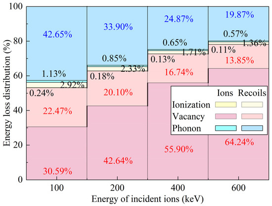 Based on the energy distributions of ions and recoiled atoms described above, the energy dissipation pathways and proportions during ion implantation were further analyzed, as shown in Figure 10. At different incident energies, at least 53% (up to 78.09%) of the total energy of incident particles is consumed through vacancy formation, thereby inducing defects within the crystal target, while at least 20% (up to 43.78%) is ultimately dissipated as phonons. This indicates that phonon dissipation plays a dominant role in ion implantation and represents the primary mechanism for converting kinetic energy into internal energy. Further analysis shows that, with increasing incident energy, the energy transferred to phonons by recoiled atoms decreases, whereas the energy transferred by incident ions gradually increases. These results demonstrate that varying the incident energy significantly affects the dominant phonon energy transfer mechanism. High-energy phonons generated by atomic collisions lead to local temperature rises, which subsequently diffuse to surrounding lower-temperature regions, enabling outward energy transfer.