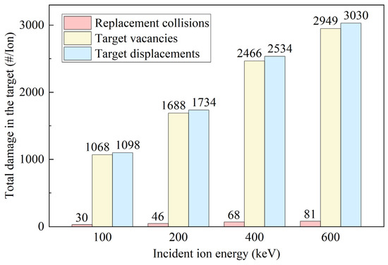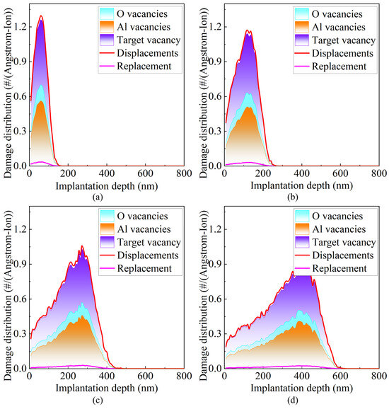 Figure 11 shows the spatial distributions of various types of damage, including vacancies, displacements, and replacement collisions, formed in the target material under different incident energies. It can be observed that, as the incident ion energy increases, the spatial extent of all damage types gradually expands, indicating that the damage penetration depth increases with energy. Meanwhile, the peak intensity decreases, suggesting that the damaged energy is spread over a larger volume, reducing local concentration. Notably, the combined intensity of oxygen and aluminum vacancies equals the total vacancy intensity of target atoms. In comparison, the overall vacancy curve lies below the corresponding displacement curve, indicating that the number of vacancies is smaller than the number of displacements, and not all displacement events produce stable vacancies. The bottommost curve represents the distribution of replacement collisions, which occur when incident atoms lose almost all their energy and can no longer advance, filling the sites left by recoiled target atoms. In other words, an incident atom displaces a target atom and then occupies its lattice site. Since they are the same element, no net change occurs in the target. Based on the damage distribution data in Figure 11, the total damage in the target at different incident energies was quantified by integration, as shown in Figure 12. It is noteworthy that, under all conditions, the total number of displacements equals the sum of vacancies and replacement collisions.