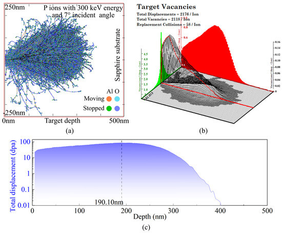 TRIM simulation results of 300 keV phosphorus ion implantation into a sapphire crystal at an incident angle of 7°. (a) Visualization of recoil cascade processes and ion trajectories; (b) three-dimensional distribution of target vacancies; (c) depth profile of total displacement damage.