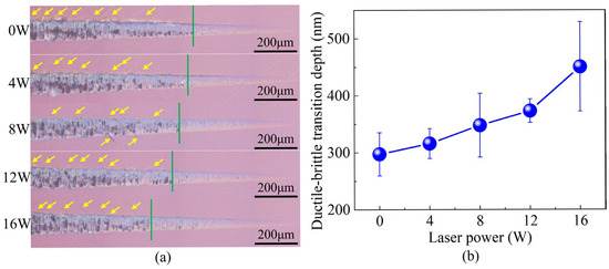 Based on the finding that microscopic defects introduced by ion implantation enhance photon absorption in the near-infrared region of sapphire crystals, the effect of laser power on the machinability of modified sapphire was further investigated. Figure 16a presents the surface morphology of sapphire after LADM. Clearly, the micro-grooves generated along the cutting direction exhibit distinct brittle and ductile zones. At the initial stage of the groove, the surface is smooth and clean, with well-defined edges, indicating that the material removal mechanism is predominantly ductile. As the cutting depth increases, pits caused by brittle fracture gradually appear and their density continues to rise, eventually making brittle removal the dominant mechanism. The green solid lines in the figures mark the ductile–brittle transition locations, beyond which the groove surface is covered with cleavage patterns and severe tearing, characteristic of brittle defects as indicated by the yellow arrows. Moreover, with increasing laser power, the extent of the ductile region slightly expands, while the size and density of brittle fracture defects on the groove surface decrease marginally at higher powers. This effect can be attributed to the enhanced thermal softening at higher laser power, which improves the material’s plastic deformation capability, allowing chip formation to occur more easily through plastic flow.