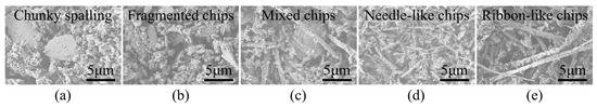 To further investigate the evolution mechanism of material removal modes, Figure 17 shows the morphology of chips generated during LADM of modified sapphire at different laser powers. In conventional cutting (0 W, without in situ laser assistance), the chips primarily exhibit irregular fragments with micron-sized discontinuous block features of random shapes. Some areas display ripple patterns caused by stress waves, reflecting the spalling and fracture of the material during removal, as shown in Figure 17a. These observations indicate that during conventional cutting of implanted sapphire, the removal process is dominated by crack propagation and cleavage fracture. As illustrated in Figure 17b,c, with increasing laser power, the amount of blocky spalling in the chips gradually decreases. At 8 W, a small fraction of ribbon-like chips appears, indicating a transition from blocky fragments to mixed chips. With further power increase, the chip morphology evolves from needle-like to ribbon-like, as shown in Figure 17d,e, with almost no blocky spalling observed. These results further confirm that LADM can enhance the ductility of implanted sapphire.