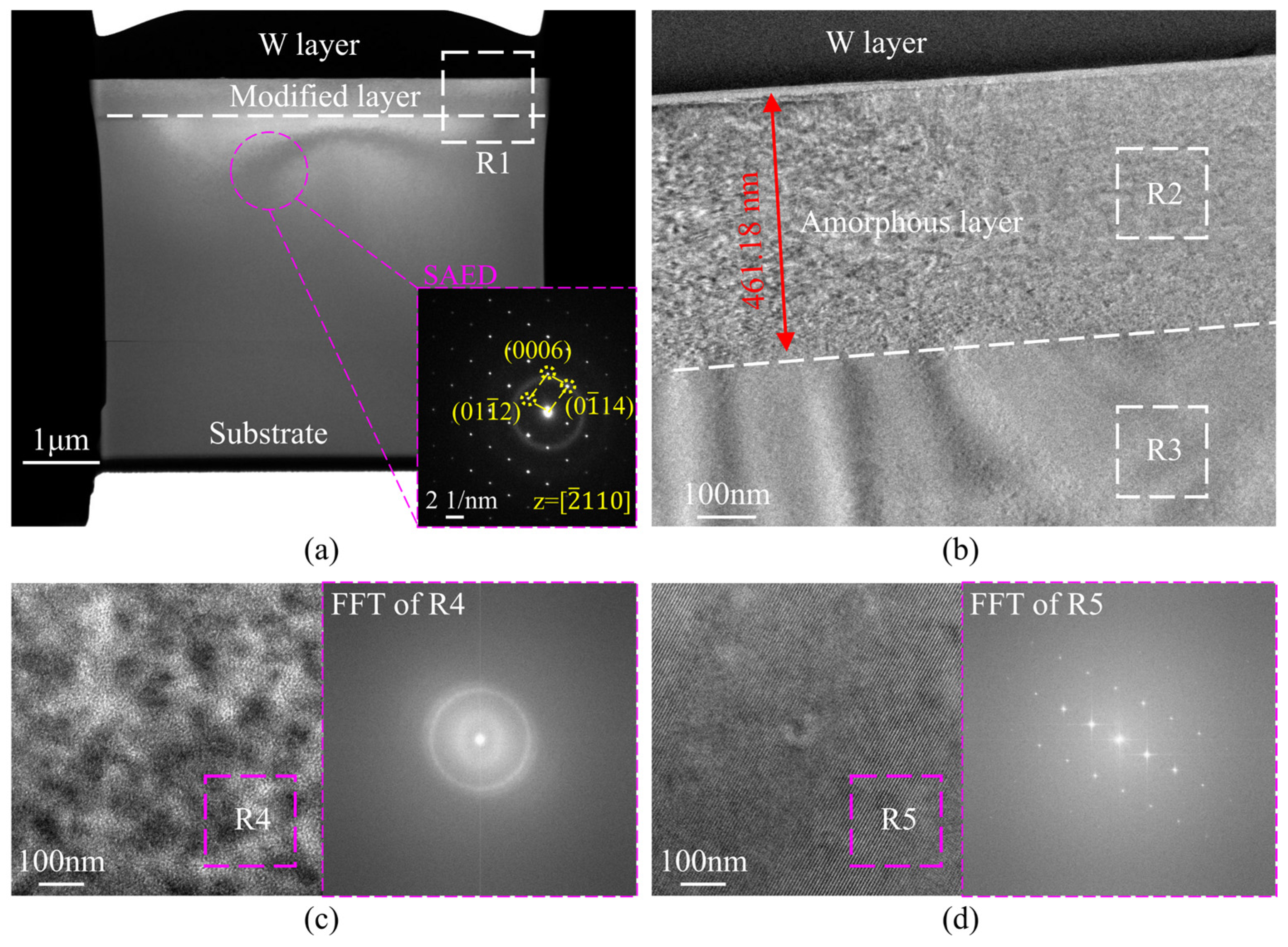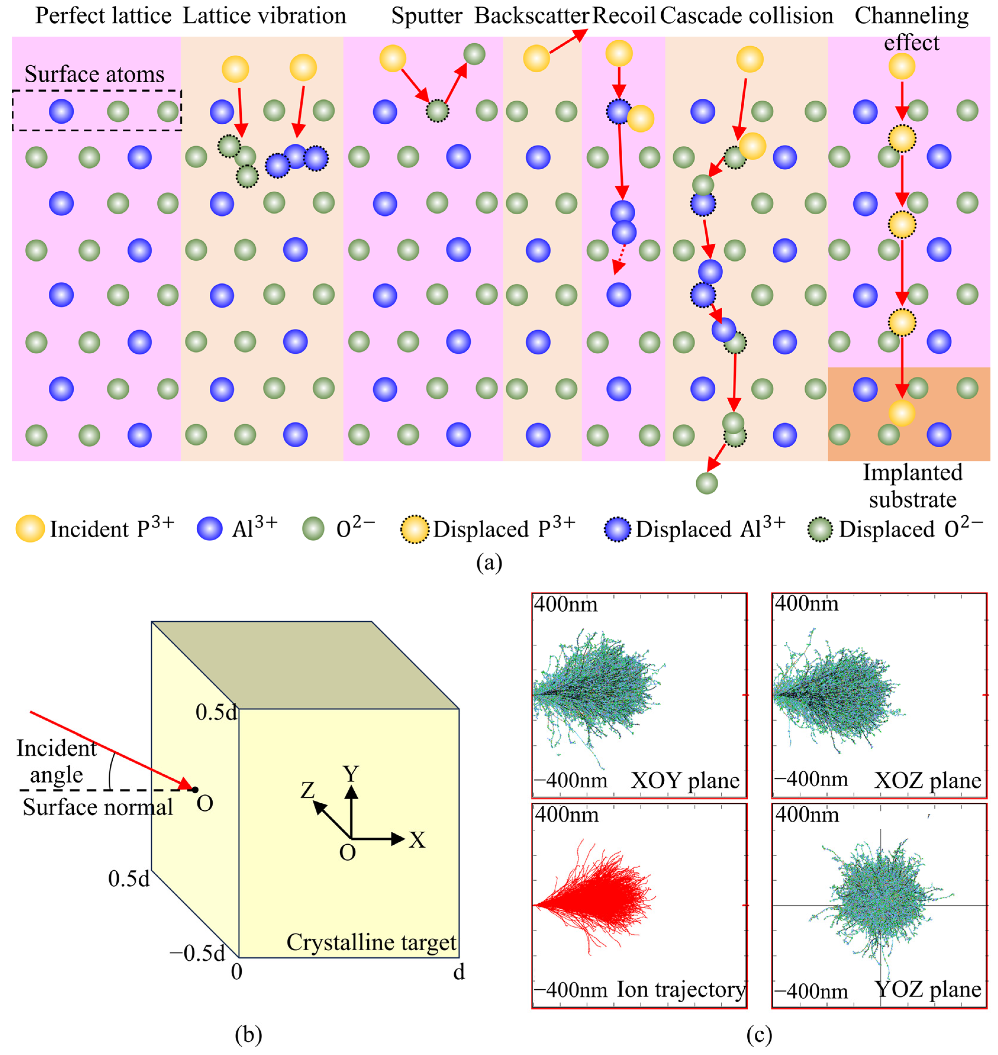 - Implantation of 300 keV phosphorus ions at a 7° incidence angle produced a uniform amorphous modified layer with a thickness of 461.18 nm. The resulting microstructural changes within the crystal increased the material’s absorption at 1070 nm from 0.39% to 4.74%, enabling the application of LADM techniques.