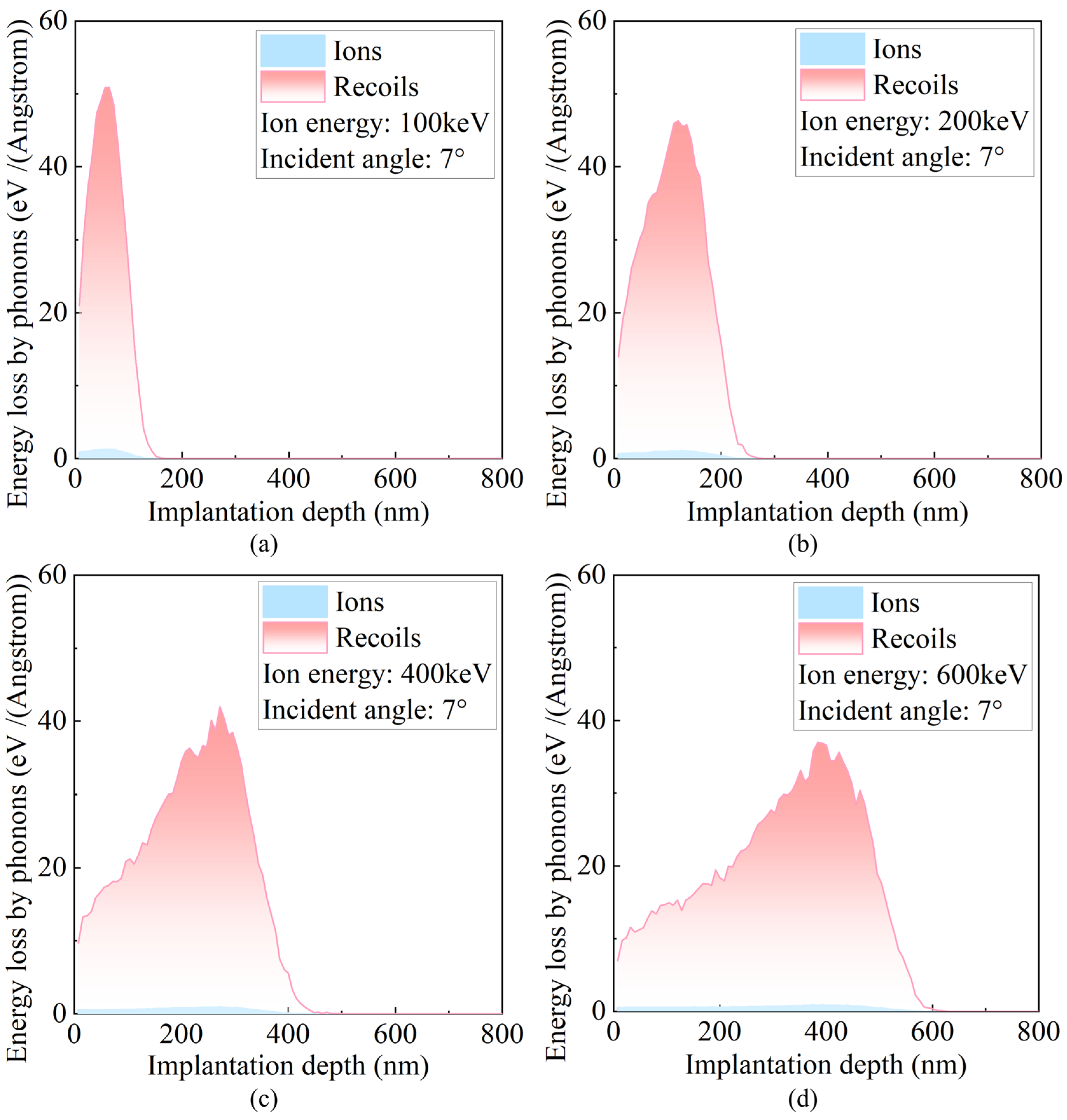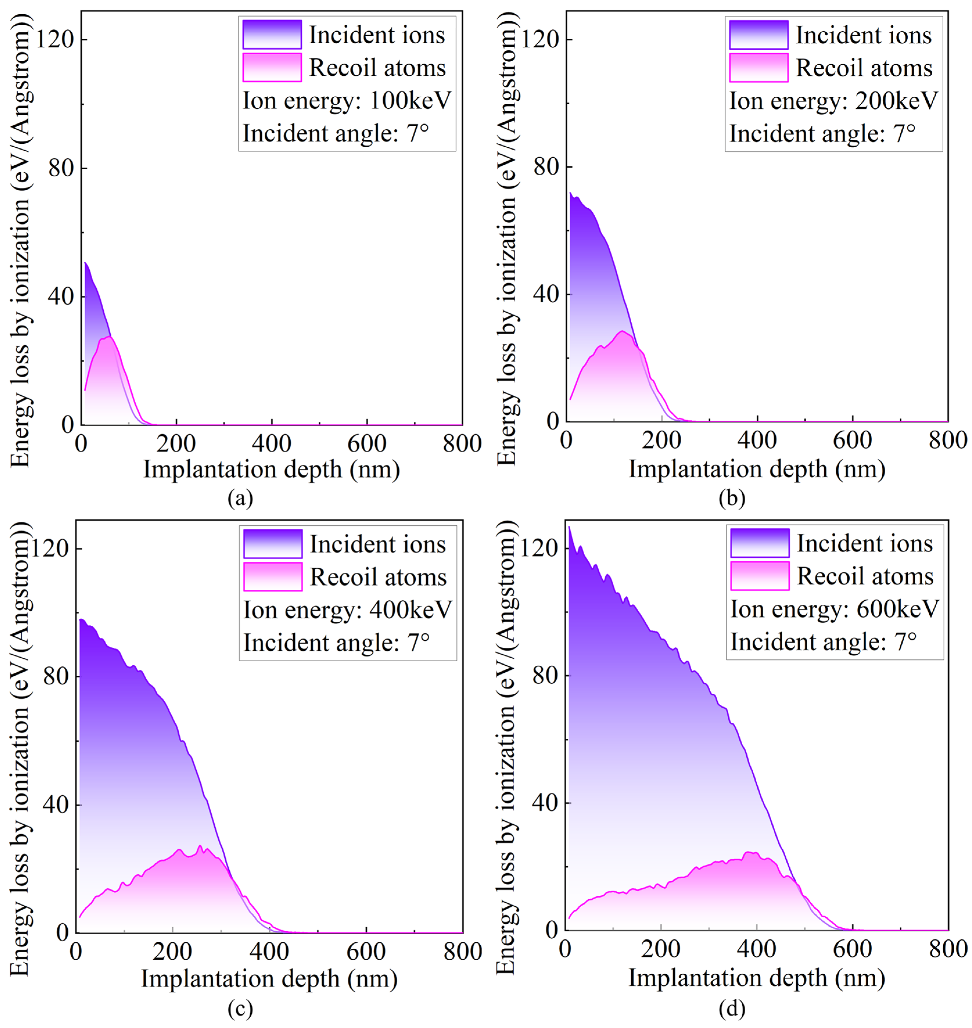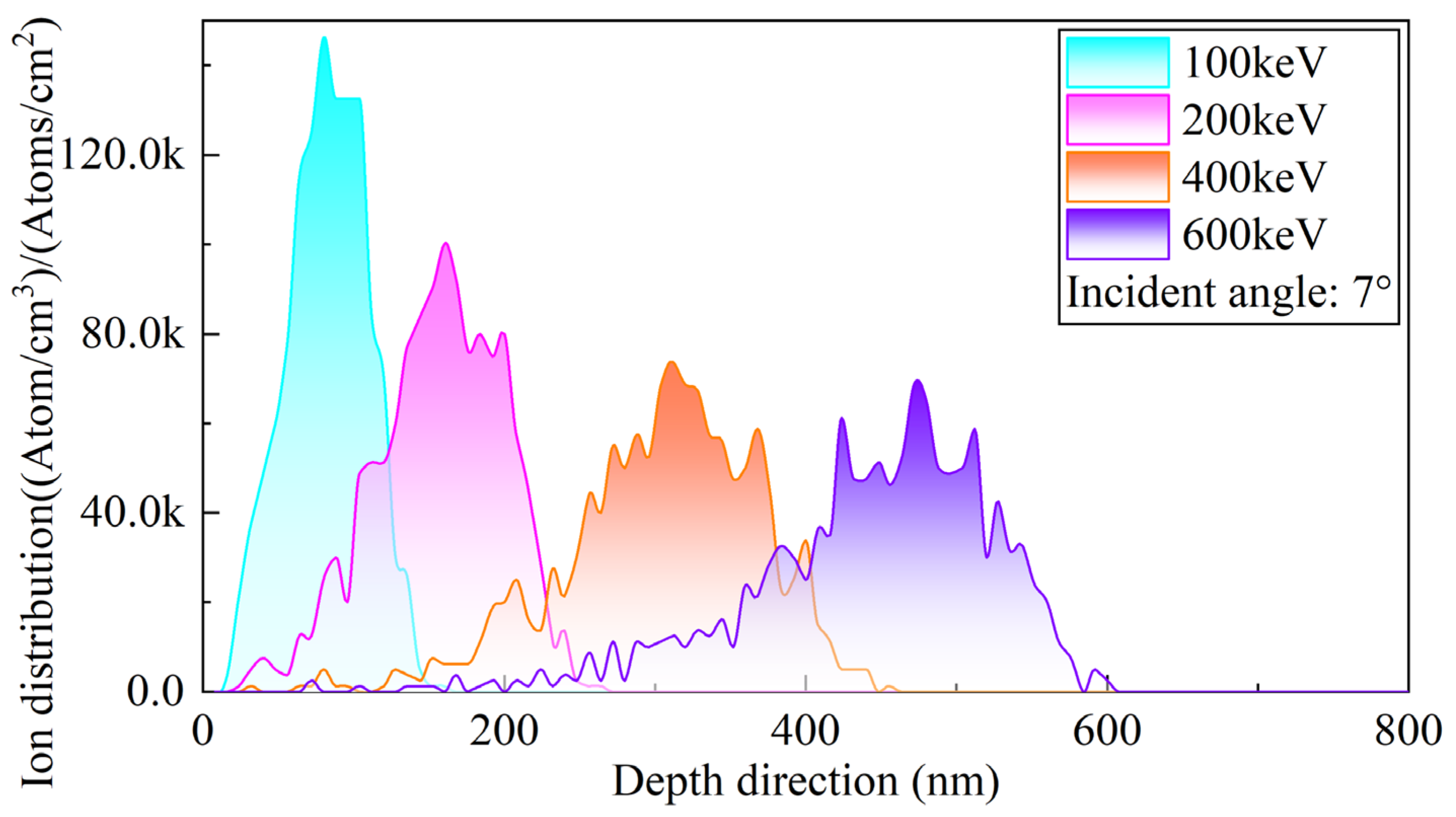 - The incidence angle and energy selection in the ion implantation process significantly affect the interaction mechanisms between ions and the target atoms. With increasing energy, the projected range of incident ions increases, the distributions of recoil atoms and energy deposition shift deeper into the material, and the damage evolves from a near-surface concentration to a more dispersed deep-layer profile.