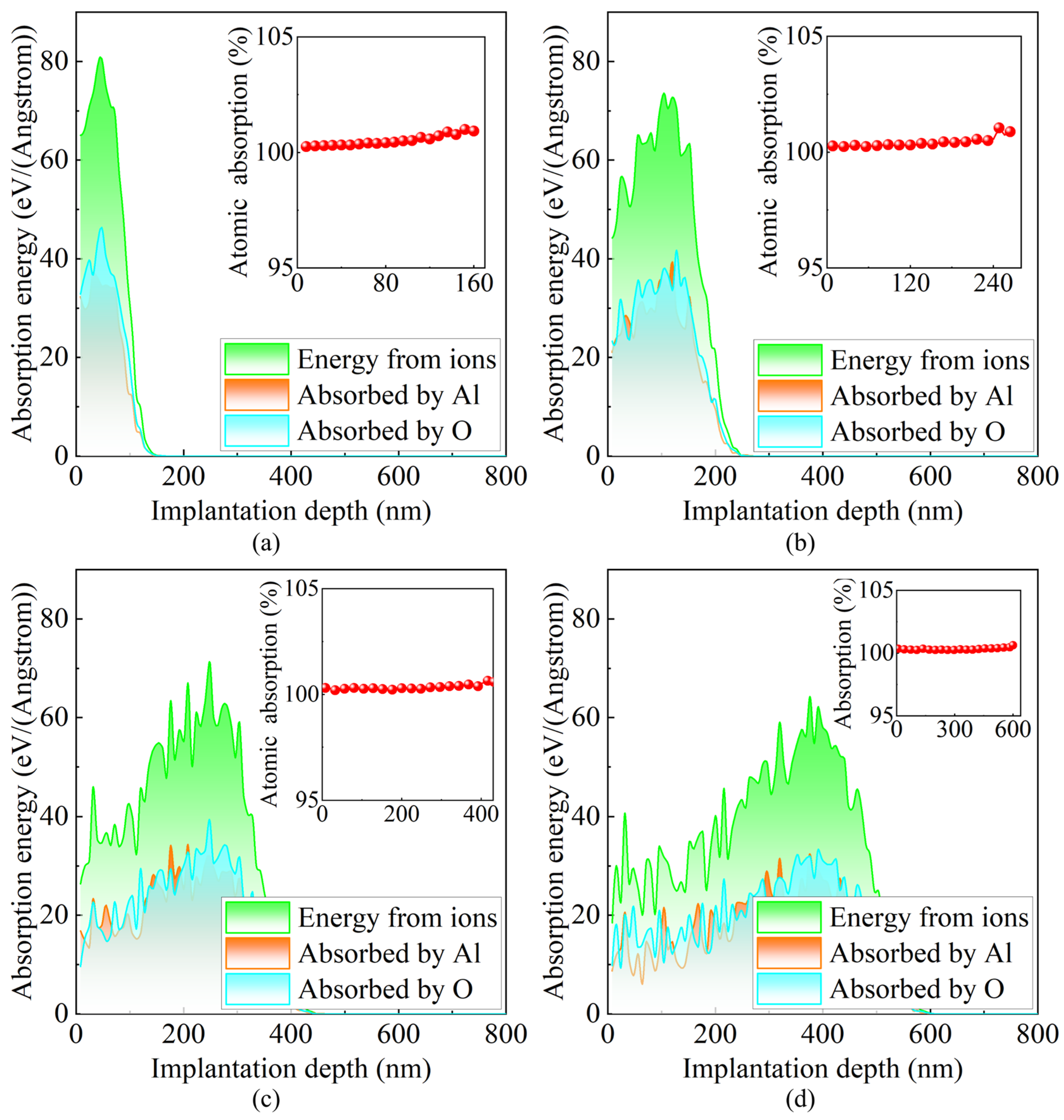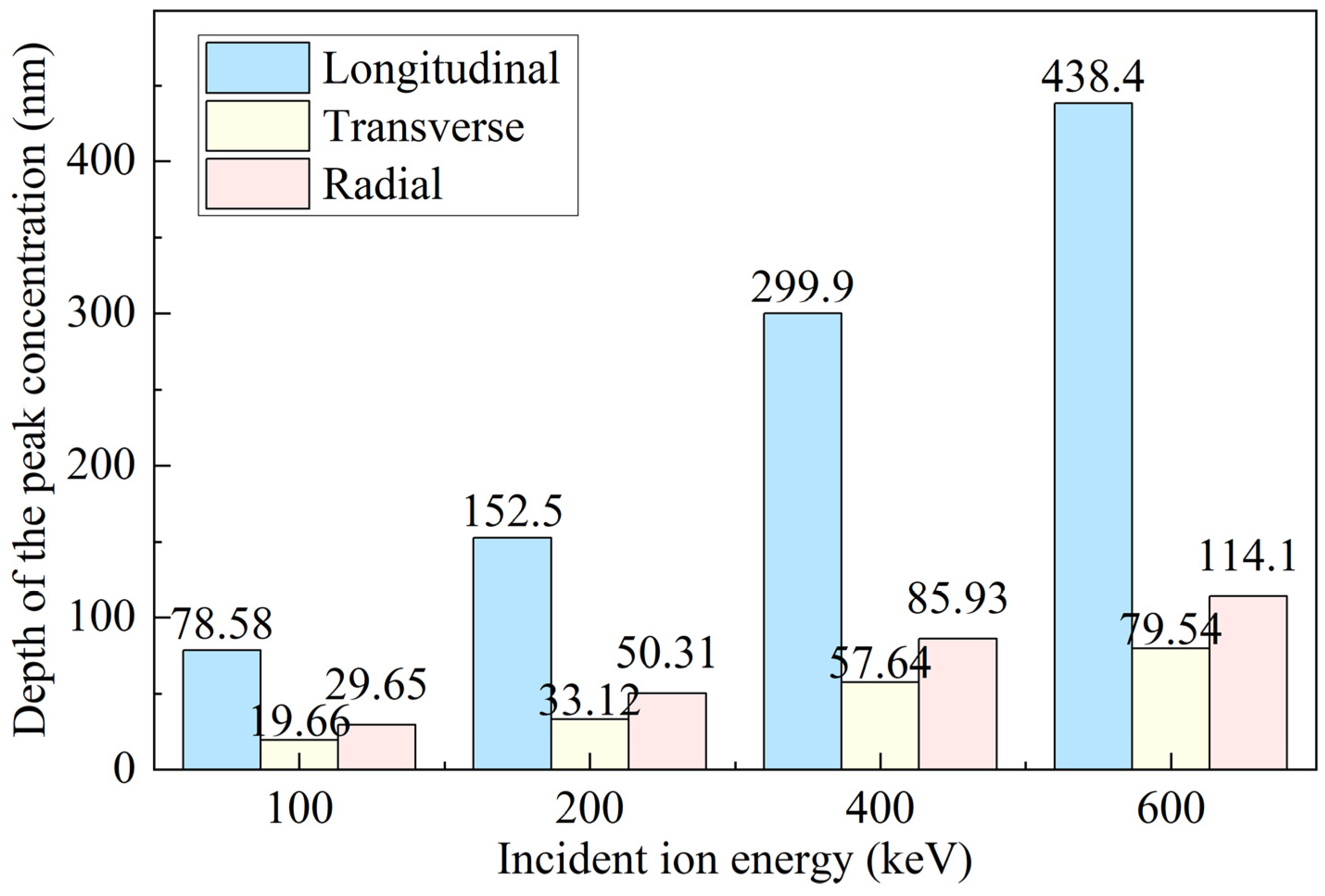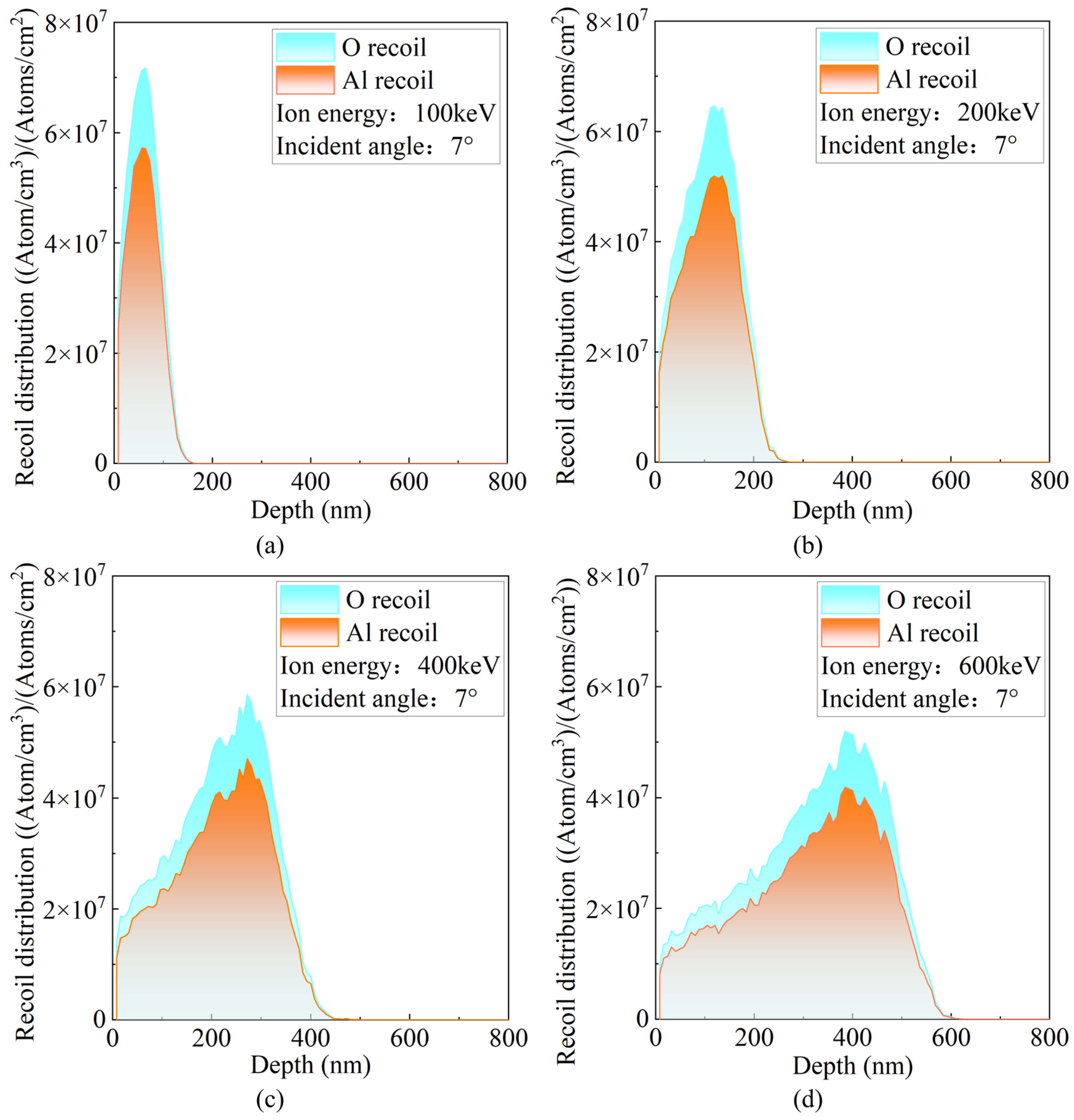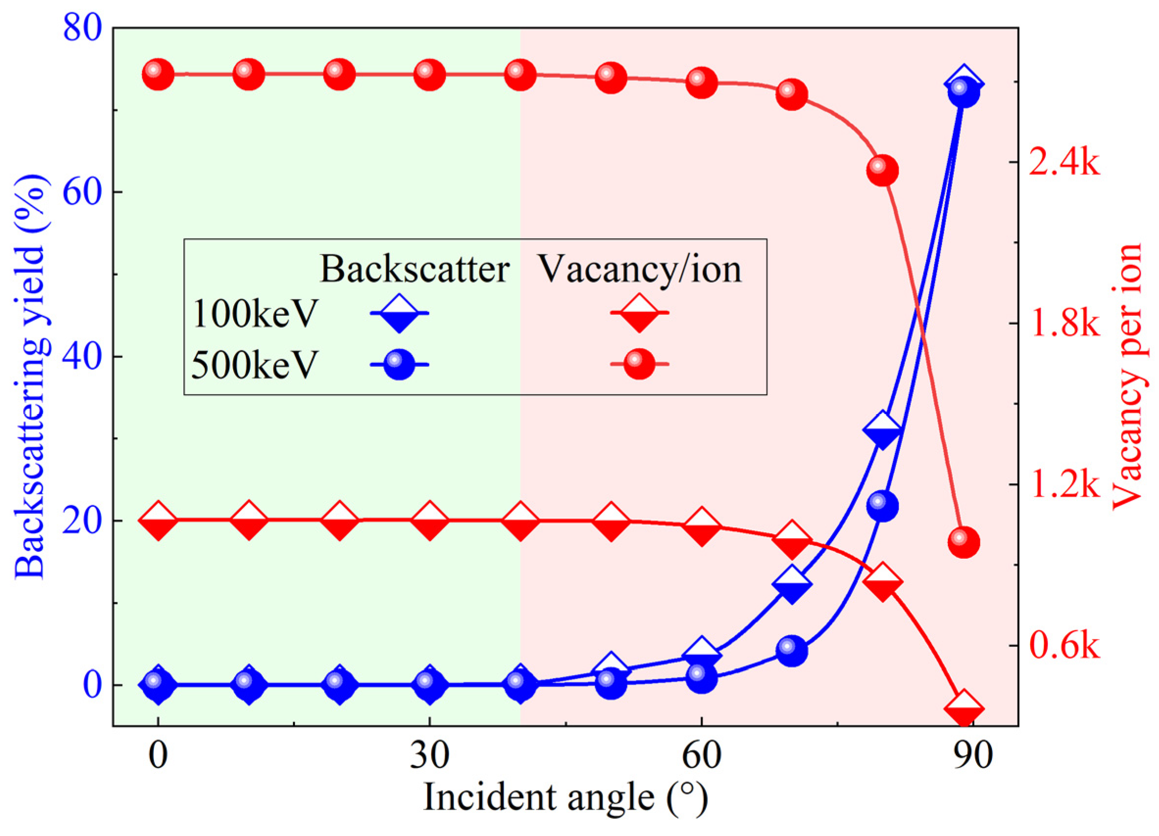 - The incidence angle and energy selection in the ion implantation process significantly affect the interaction mechanisms between ions and the target atoms. With increasing energy, the projected range of incident ions increases, the distributions of recoil atoms and energy deposition shift deeper into the material, and the damage evolves from a near-surface concentration to a more dispersed deep-layer profile.