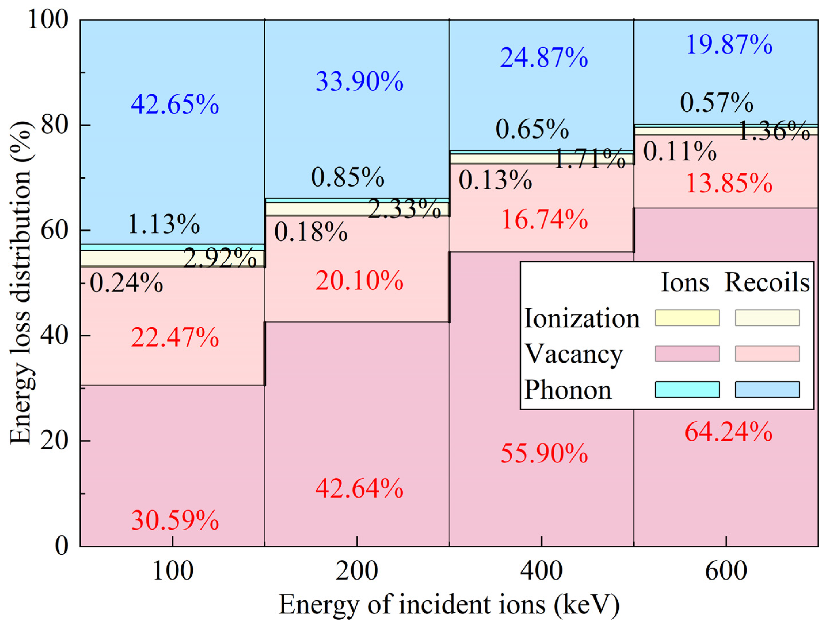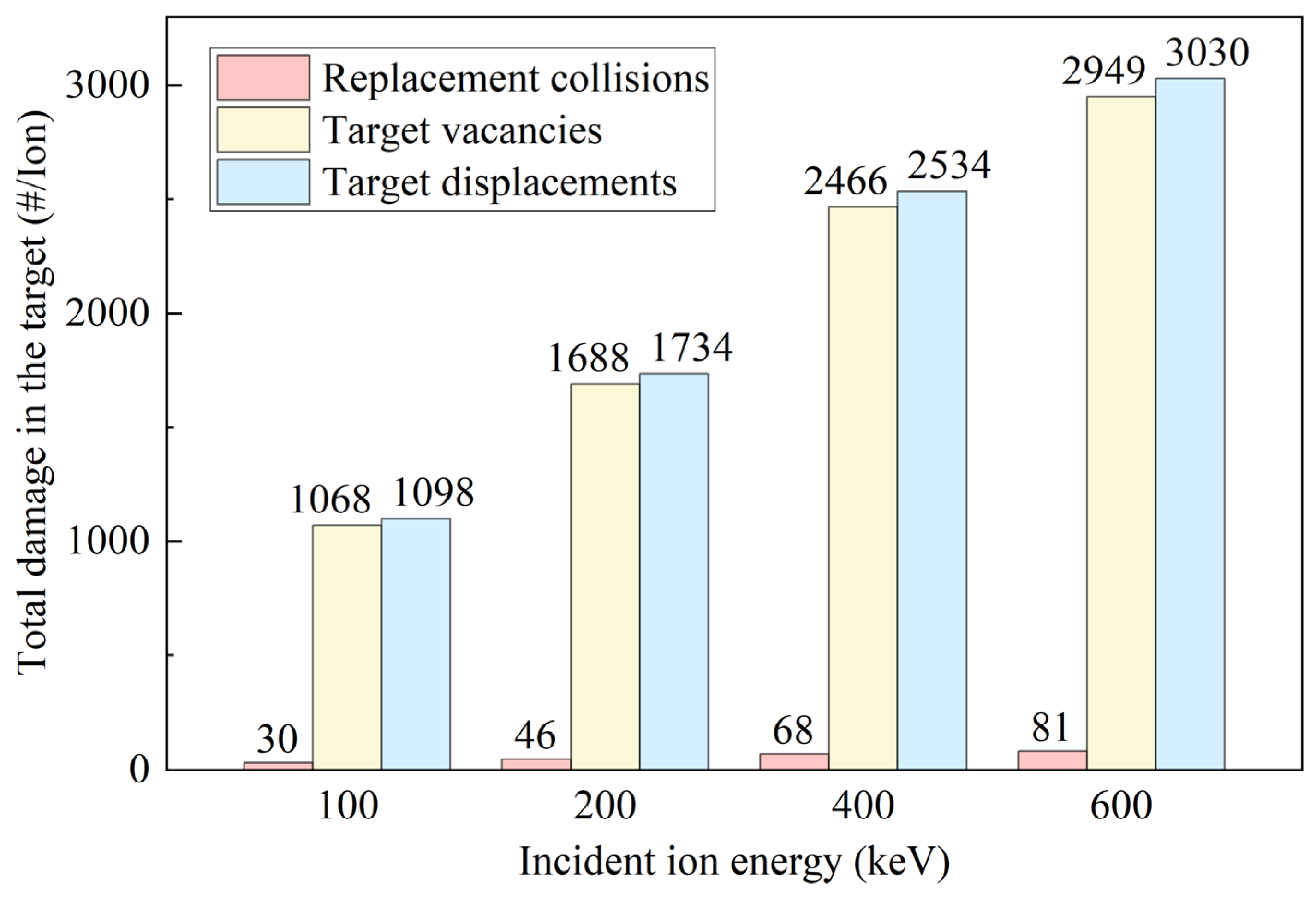 - Under all energy conditions, at least 53% of the total energy of the incident ions is dissipated through vacancy formation, inducing internal defects within the crystal. Phonon-mediated energy dissipation serves as the primary pathway for converting kinetic energy into internal energy. Additionally, the total number of displacements equals the sum of vacancies and replacement collisions.