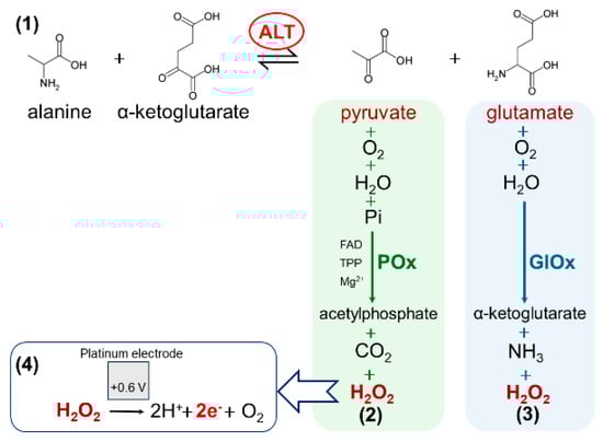 ALT itself cannot be detected directly by electrochemical biosensors, because it has no strong electroactive properties. Therefore, ALT activity (amount of enzyme required to convert 1 μmol of substrate to product per minute) is measured through its reaction products, such as glutamate or pyruvate, that are detected using special enzymes. One of these special enzymes is pyruvate oxidase (POx), used in works [,], which reacts (Figure 1, reaction 2) with pyruvate to form hydrogen peroxide, a compound that can be measured using amperometry. Another more frequently used option is glutamate oxidase (GlOx), as reported in [,], which reacts (Figure 1, reaction 3) with glutamate producing hydrogen peroxide. When hydrogen peroxide reaches the platinum electrode, it breaks down (Figure 1, reaction 4) at an applied potential (about +0.6 V), generating electrons and changing the electric current. A recent review summarizes the prevalence, typical architectures, and main limitations of GlOx- and POx-based ALT biosensors, highlighting current trends toward improved stability and multiplexing in clinical applications [].
