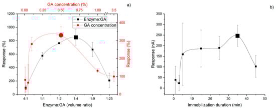 Dependence of the GlOx-based biosensor responses on immobilization parameters: glutaraldehyde (GA) concentration and the volume ratio of GA to enzyme gel (a), and on immobilization time (b).