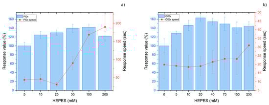 For the efficient performance of each enzyme (POx or GlOx) within the biorecognition element, a stable working environment is required. This is achieved using an appropriate buffer system that ensures constant pH, even when analyzing complex biological samples. Since the biosensors were designed to operate with biological fluids of pH 7–8 (e.g., blood), HEPES buffer with a matching pH range was employed. Optimization of the buffer concentration revealed that for the POx-based biosensor, the optimum concentration was 25 mM, despite the highest responses being observed at 100 mM. A concentration of 25 mM HEPES was selected because, at this value, the fastest responses were obtained while maintaining a sufficiently high response magnitude (Figure 5a). The increase in response time at higher buffer concentrations can be explained by an excessive buffering capacity, which hinders the local pH change required for catalysis at the POx active site. For the GlOx-based biosensor, the optimum HEPES concentration was 20 mM (Figure 5b). In this case, no significant increase in response time was observed by increasing the buffer capacity, unlike for POx (at 100 mM HEPES, approximately 20% for GlOx, compared to 540% for POx). This behavior may be explained in two ways: either the working pH corresponds more closely to the pH in the GlOx active site during catalysis, or GlOx carries out the catalytic process more easily and stably. The pH dependence can be supported by the fact that the optimum pH of GlOx is 7.0–7.4 [,], while the optimum pH of POx lies within 6.5–7.0 []. Thus, the optimum of GlOx is closer to the working conditions used in our experiments. Regarding catalytic efficiency, the reported kcat of GlOx is 85.8 s−1 [], whereas exact values for POx from Aerococcus viridans are not available. However, a similar enzyme such as pyruvate:quinone oxidoreductase has a kcat of 37.8 s−1 [], and based on supplier data on specific activity, the estimated kcat of POx is 35 U/mg × 66.25 kDa per subunit [] = 38.6 s−1. Therefore, the catalytic activity of GlOx can be considered more than twofold higher.