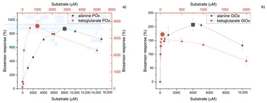 Dependence of biosensor responses on ALT substrate concentrations (alanine, α-ketoglutarate) for POx-based (a) and GlOx-based (b) systems.