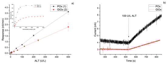 It is well known that the final stage of biosensor development involves the investigation and analysis of its analytical characteristics. These parameters make it possible to assess the applicability of the developed biosensor for detecting the target analyte in relevant biological fluids and within clinically meaningful concentration ranges. Both biosensors developed in this study demonstrated wide working ranges for the determination of the intermediate analyte (pyruvate or glutamate) (Figure 9a, Table 1). The real amperometric responses of the biosensors towards hydrogen peroxide, pyruvate, and glutamate are shown in the Supplementary Figure S5. The ALT detection ranges for both biosensors were also comparable and sufficiently broad (approximately 1–500 and 5–500 U/L ALT for the systems based on POx and GlOx, respectively) (Figure 9b, Table 1), thus enabling the detection of both normal (30 U/L []) and elevated (up to 15 times higher []) ALT levels in blood serum with either biosensor accounting for 10-times dilution.