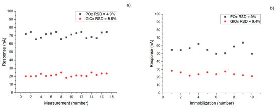 Reproducibility of responses is critically important in biosensorics, as it ensures signal stability and enables repeated measurements with minimal variability. Similarly, reproducibility of biological material immobilization plays a key role not only for sensor reliability but also for scalability and commercial translation of the technology. Both biosensors exhibited acceptable values for these parameters (within 10%) (Figure 10); however, the POx-based system proved to be slightly more stable compared to the GlOx-based one. Storage stability was preliminarily evaluated for the intermediate analytes, showing that after two months of storage in a dry frozen state, the POx-based biosensor retained 40% of its activity, while the GlOx-based biosensor retained 70%.