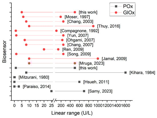 - The linear ranges of POx-based biosensors were either very narrow at ultralow concentrations (notably in 0.0005–0.18 oxygen [] and 0.0003–3.0 U/L graphite [] electrode systems) or wider than those observed for GlOx-based biosensors (Figure 11).