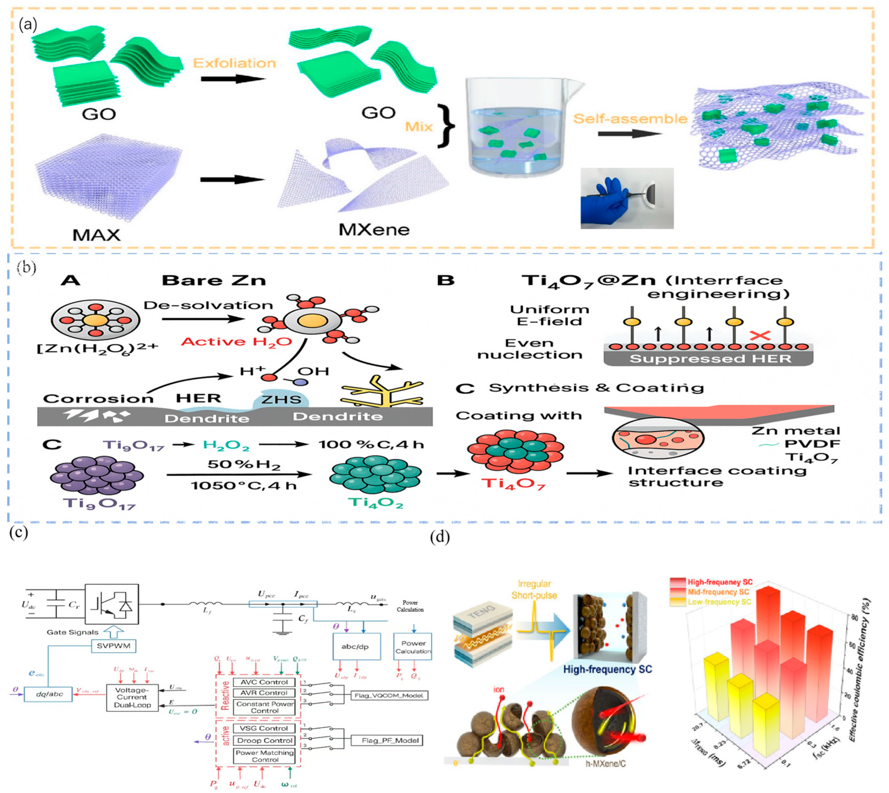 Advancements in energy storage technologies adapted for TENGs. (a) Fabrication of a flexible MXene/GO electrode with enhanced ion diffusion for high-rate supercapacitor performance. (b) Zn-ion battery electrode design using Ti-based interfacial layers to facilitate rapid charge transfer under TENG pulsed input. (c) Grid-type hybrid energy storage system enabling frequency-domain power allocation between battery and supercapacitor. (d) Hollow-structured MXene-based electrode with 3D ion transport network designed to match TENG high-frequency pulsed output. Figure from ref. [], used with permission of the Creative Commons CC-BY.