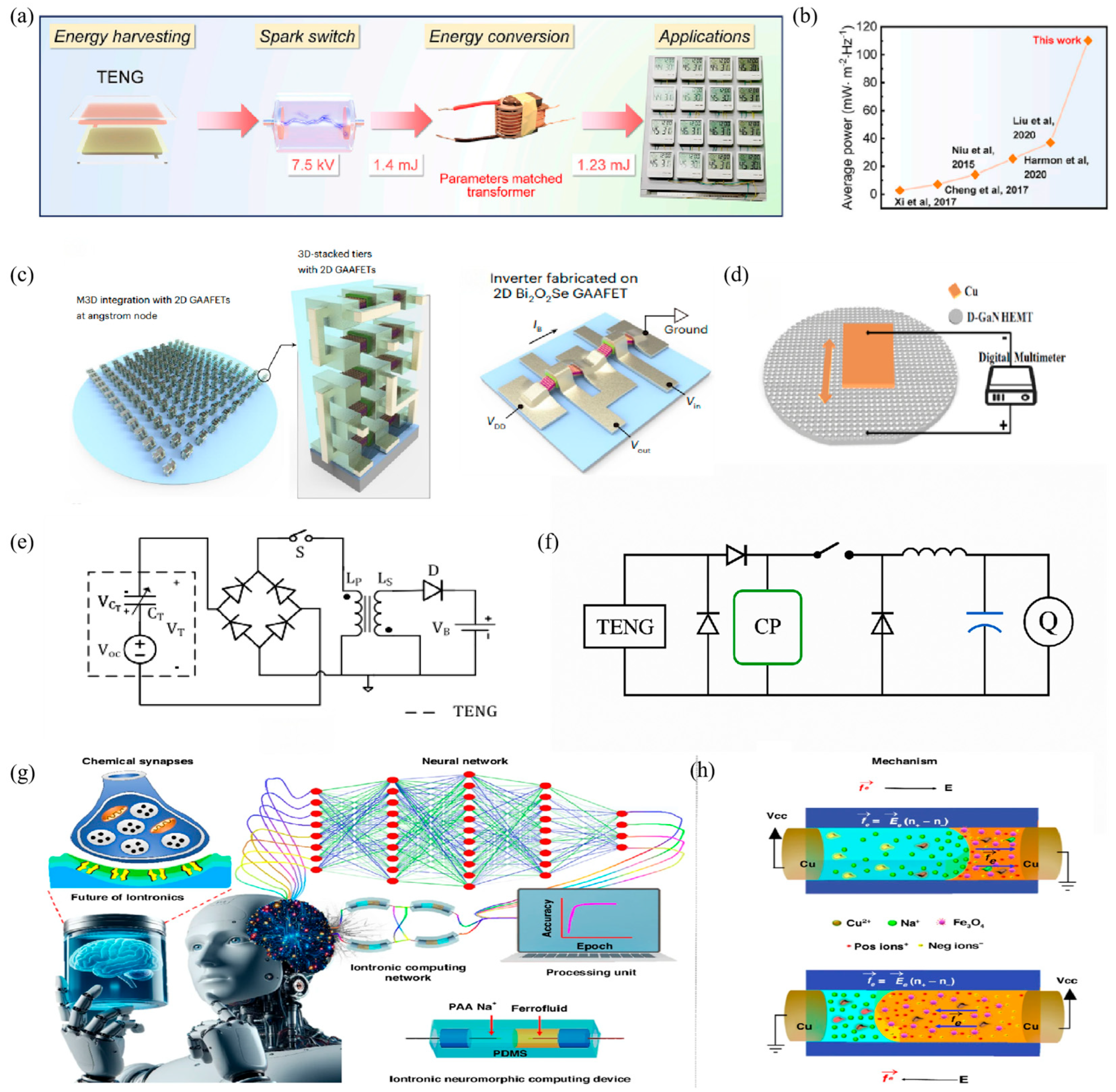 Advanced PMC designs tailored for TENGs. (a) TENG output triggering an automatic spark switch for pulse discharge. (b) Comparative chart of average output power of various TENG-PMC systems. (c) Diagram of 2D Bi2O2Se/Bi2SeO5 GAAFET-based logic circuit for ultra-low-power TENG sensing systems. (d) SEM image and system integration of Cu/etched D-GaN HEMT architecture tailored for high-efficiency TENG energy extraction. (e) SCE circuit with fixed timing switch mechanism. (f) Buck-regulated topology added to improve output voltage stability and match load requirements. (g,h) Iontronic fluidic memristor and ionic liquid channel structure demonstrating neuromorphic adaptation under TENG-powered input. Reproduced with permission from ref. []. Copyright 2021, Elsevier. Reproduced with permission from ref. []. Copyright 2025, Springer Nature. Reproduced with permission from ref. []. Copyright 2024, Elsevier. Reproduced with permission from ref. []. Copyright 2024, Elsevier. Reproduced with permission from ref. []. Copyright 2023, Elsevier. Reproduced with permission from ref. [], used with permission of the Creative Commons CC-BY.