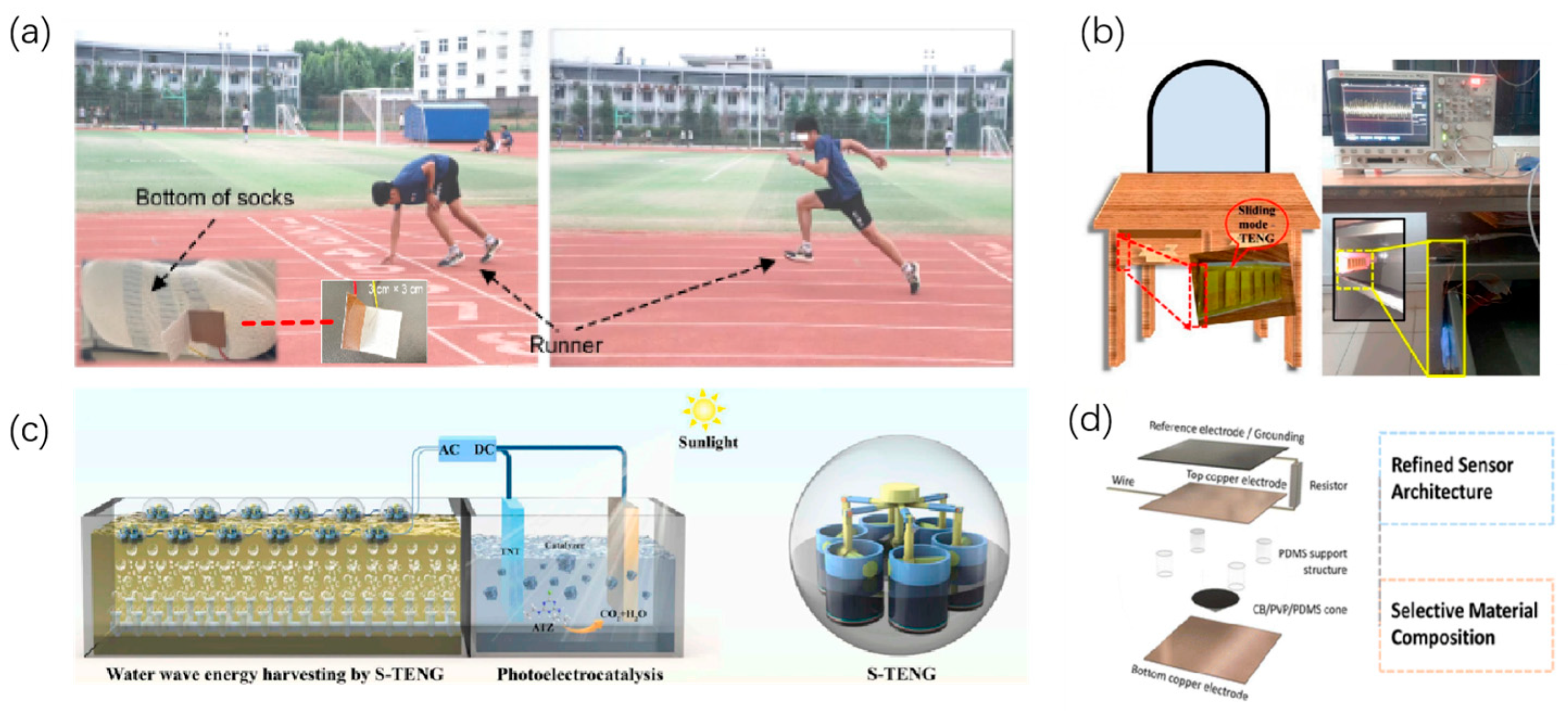 TENG’s dual roles as energy harvester and self-driven sensor enable an “integrated sensing–energy supply” paradigm for IoT and distributed networks []. Unlike short-lived, costly, and polluting batteries, TENG-based self-powered sensors facilitate large-scale deployment while reducing maintenance requirements in smart industrial IoT []. By directly converting ambient mechanical energy into electrical energy, TENGs produce output signals that are linearly correlated with mechanical stimulus parameters, thereby realizing the synergistic optimization of “energy generation–signal sensing” []. For example, in wearable healthcare applications, TENGs capture energy from gait and simultaneously enable self-driven monitoring of heart rate signals, effectively addressing the system-complexity challenges associated with the “power-sensing” separation in conventional sensors, as shown in Figure 1 []. Lu reported on an ocean-buoy system in which a magnetically levitated TENG exhibited < 8% output fluctuation across −40 to 85 °C and achieved continuous, maintenance-free monitoring for 12 months [].