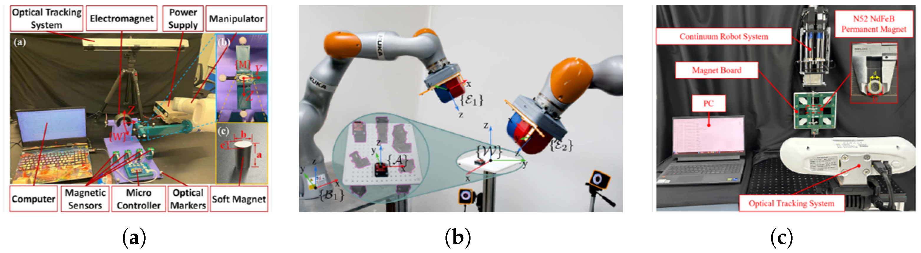 - Liu, S.; Wang, H. A Wireless 6-DoF Pose Tracking System Using a Triaxially Anisotropic Soft Magnet. IEEE/ASME Trans. Mechatron. 2025, 30, 1224–1235. [Google Scholar] [CrossRef]