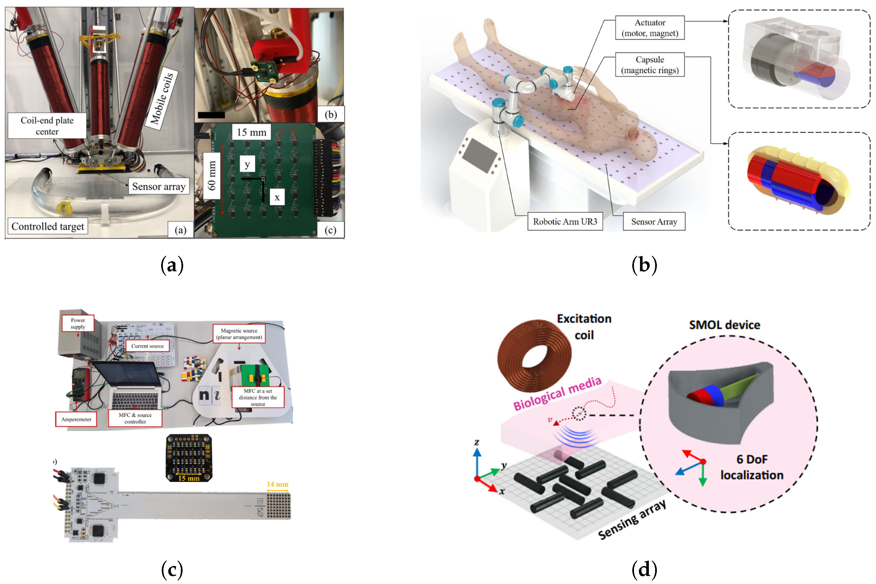 - Wang, M.; Song, S.; Liu, J.; Meng, M.Q.H. Multipoint Simultaneous Tracking of Wireless Capsule Endoscope Using Magnetic Sensor Array. IEEE Trans. Instrum. Meas. 2021, 70, 1–10. [Google Scholar] [CrossRef]
