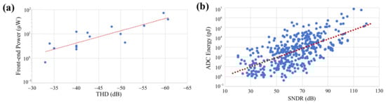 (a) THD versus system power consumption in front-end circuits of various neural recording systems over the past decade [,,,,,,,,,,,,,]. (b) SNDR versus ADC energy of various ADCs collected from the 1997 to 2023 ISSCC [].