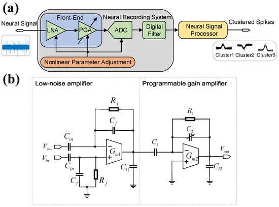 Figure 2a illustrates the overall architecture of a typical neural recording system, which comprises an LNA, a PGA, an ADC, and a digital filter. Each stage operates sequentially as follows. First, the LNA amplifies weak neural signals while suppressing electrode direct current (DC) offset voltages through a high-pass pole. Subsequently, the PGA provides appropriate gain to ensure signal linearity and maintain the input voltage within the ADC’s dynamic range. After being digitized by the ADC, the recorded signals undergo digital filtering before being transmitted to the neural signal processor for spike detection and sorting. Collectively, these stages preserve signal fidelity and ensure high processing accuracy in neural recording systems [,,,,,,,,,]. To evaluate the impact of non-linearity parameters on spike processing accuracy, the non-linear models of each stage are presented in the following subsections.