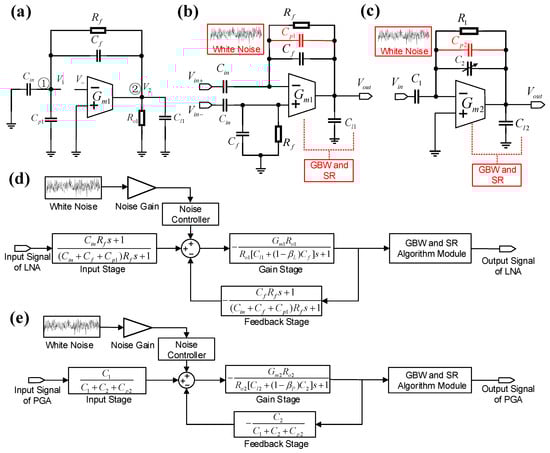 Illustrations of the non-linear model process of the front-end circuits. (a) Open-loop configuration of the LNA. (b) Simplified diagram of LNA with non-linear parameters in red. (c) Simplified diagram of PGA with non-linear parameters in red. (d) Simplified diagram of non-linear LNA model in Simulink. (e) Simplified diagram of non-linear PGA model in Simulink.