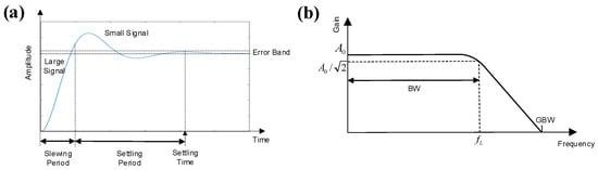 The systematic integration of non-linear parameters in the LNA and PGA is illustrated in Figure 3b,c, respectively. In addition to the parasitic capacitance effects, critical performance metrics including gain–bandwidth product (GBW) and slew rate (SR) are incorporated. As shown in Figure 4a, the OTA’s transient response to a step input exhibits dual-phase characteristics: (1) an initial slewing period governed by large-signal limitations, such as SR, (2) a settling period dictated by small-signal constraints, including GBW [,,]. The total response time encompasses both slewing and settling periods and requires the OTA output to stabilize within the specified error band. Therefore, both GBW and SR collectively influence the transient response of the OTA.