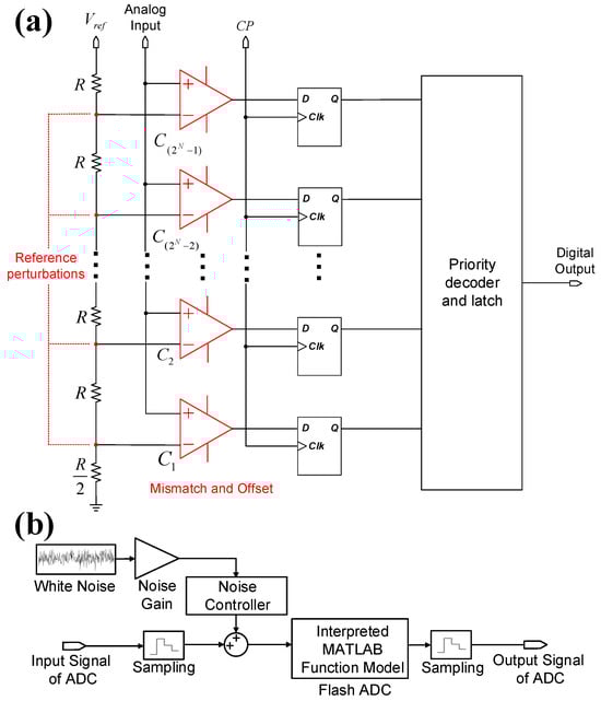 In this model, the flash ADC is chosen as a behavioral model because its architecture provides a direct method for simulating non-linearities. While this topology is not practical for low-power applications, our analysis focuses on the impact of overall output performance, such as THD and SNDR. Because these specifications are common to all ADC topologies, the design guidelines derived from this model are considered to have high scalability and can be generalized to more practical implementations like Successive Approximation Register (SAR) or Delta–Sigma ADCs.