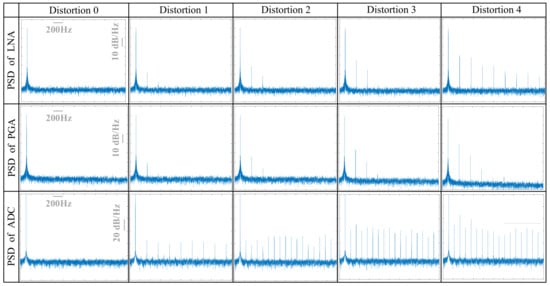 Table 1, Table 2 and Table 3 illustrate the distortion levels and signal characteristics through quantitative metrics of the LNA, PGA, and ADC, respectively, while Figure 6 shows the PSD corresponding to each distortion level.