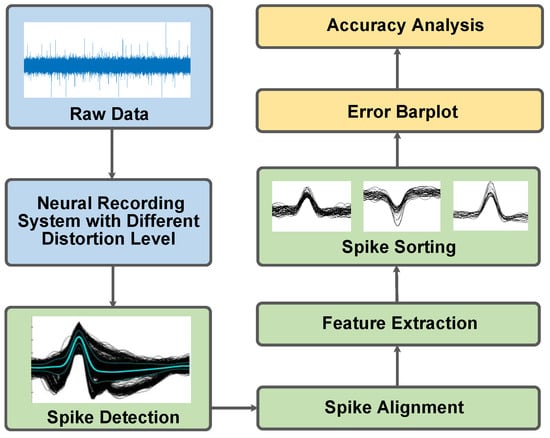 The proposed non-linear models are validated with neural signals from an open-source database [], which serves as a ground truth dataset that contains 14.4 million data points with approximately 4800 annotated spike events. The validation process begins with raw neural signals that are bandpass-filtered (200–3000 Hz) to extract action potentials. These filtered signals are subsequently processed through the modeled neural recording system under configured non-linearity levels. As illustrated in Figure 7, the system outputs are then subjected to a comprehensive spike processing pipeline, which comprises spike detection, spike alignment, feature extraction, and spike sorting [,]. Finally, the spike detection and sorting outputs are statistically analyzed to obtain accuracy results.