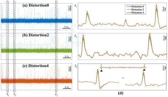 Time-domain spike output waveforms of the front-end circuits at (a) distortion level 0 (linear mode), (b) distortion level 2, (c) distortion level 4. (d) Zoom-in spike waveforms corresponding to the time windows t1, t2, and t3.