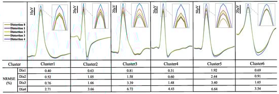 Various simulated spike clusters of the front-end circuits at different distortion levels, where NRSME is calculated to quantify spike cluster waveform deformation across different distortion levels (distortion level 1 to level 4 vs. distortion level 0).