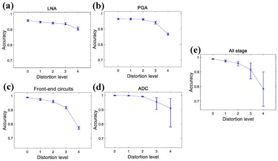 Simulated accuracy bar graphs at different distortion levels for (a) LNA stage, (b) PGA stage, (c) front-end circuits, (d) ADC stage, (e) entire system.