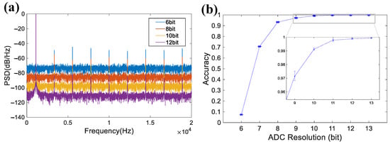 In addition to non-linearity, ADC resolution n significantly affects signal accuracy. Figure 11a presents the PSD characteristics for different ADC resolutions, which demonstrates that lower resolutions increase both the noise floor and harmonic distortion.