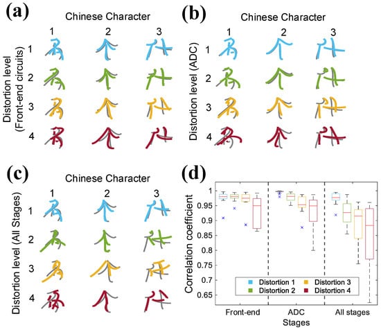 Decoded trajectories of three representative Chinese characters (名,个,什) at different distortion levels for (a) front-end circuits, (b) ADC, (c) entire system. (d) Pearson’s correlation coefficients of all 15 trails at different distortion levels for front-end circuits, ADC, and entire system.