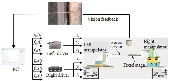 Here, the distances between coordinate frames (e.g., x 01 ) are fixed by the mechanical assembly. Consequently, the end-effector’s position is governed solely by the displacement of each DOF (e.g., l 2 ). Therefore, once the end-effector’s position is identified by the microscope, the deflection from the desired position can be calculated. The deviation between the desired position and the current position of the manipulator is then used to compute the required displacement for each degree of freedom of the microrobot based on Equations (2) and (3). The resulting displacement is subsequently sent to the driver to generate the corresponding drive signals.