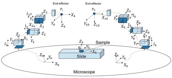 Before controlling the manipulator to the desired position, it is necessary to determine the position of its end-effector relative to the microscope’s field of view. To achieve this, a coordinate system is established, as illustrated in Figure 2. The base coordinate system {0} is fixed on the microscope stage, while the coordinate system of the left end-effector is defined as {4}. The transformation matrix between {0} and {4} is then derived as follows.